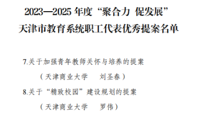 近日,天津市教育工会发布了《2023——2025年度“聚合力 促发展”天津市教育系统职工代表优秀提案名单》,共有11项教职工提案被评为天津市教育系统职工代表优秀提案。其中我校机械工程学院院长刘圣春教授《关于加强青年教师关怀与培养的提案》与外国语学院罗伟副教授《关于“精致校园”建设规划的提案》2项提案从众多提案中脱颖而出,入选此名单。
